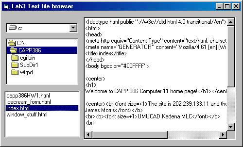 | Lab 4 | Make a form that looks like this and behaves like this. It's a "text file browser" program. | Make another form that looks like this and behaves like this |