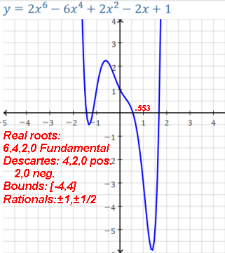 Ex. a degree-5 polynomial could have 5, 3, or 1 real roots. A degree-6 could