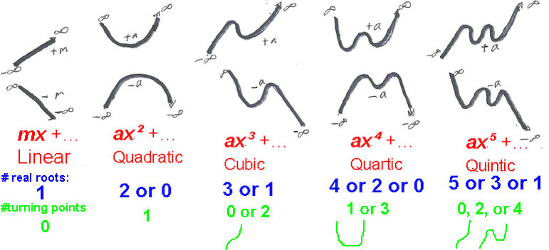 Life of a polynomial function: it comes from one of the infinities, does some wiggling, then goes off to one of the infinities. The more terms, the more "wiggle". Constants and linears: no wiggle; quadratics: one swoop...
