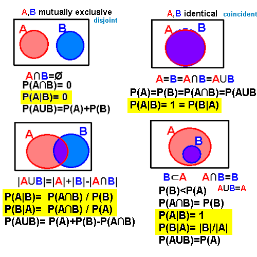 Probability of A occurring = P(A) : Probability of B occurring = P(B) : Probability of both A and B occurring = P(A and B) : = P(B and A) = P(A ∩ B) = P(AB) "joint probability" ≤ min(P(A),P(B))